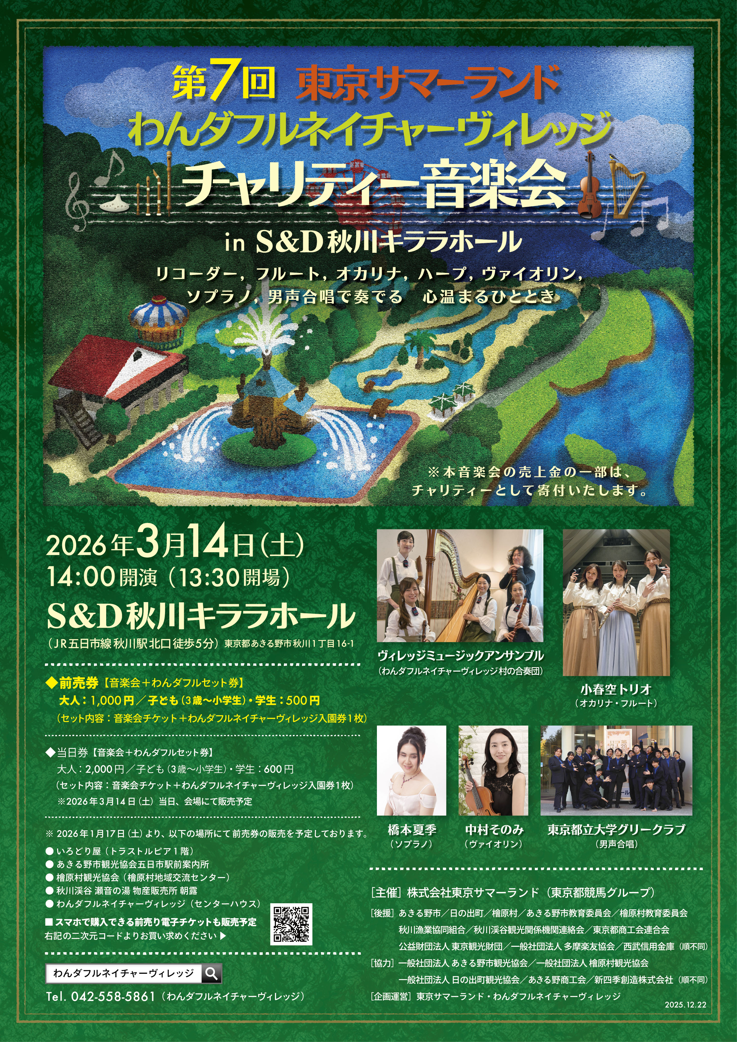本音楽会の売上金の一部は、チャリティーとして寄付いたします。 前売券は、音楽会チケット+わんダフルネイチャーヴィレッジ入園券がセットになった前売セット券のみの販売となります。 ※音楽会チケットは2026年3月14日(土)開催当日のみ有効となります。 ※わんダフルネイチャーヴィレッジ入園券1枚につき、大人(中学生以上)1名または犬1頭がご利用いただけます。 (有効期限:2026年7月12日(日)まで) |