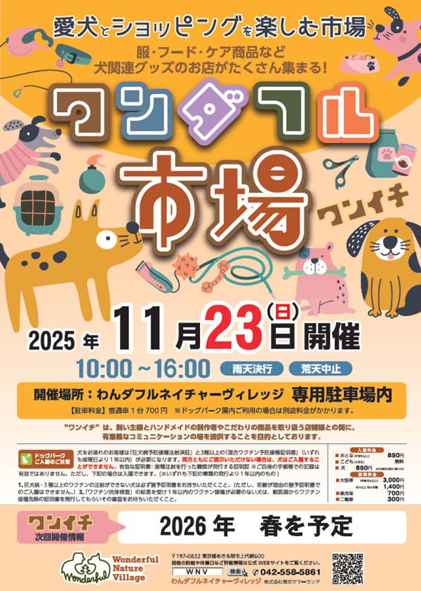 ワンダフル市場略して「ワンイチ」は、愛犬とショッピングを楽しむ、わんダフルネイチャーヴィレッジのイベントです。このイベントは、生産者やこだわり店舗を飼い主様へ直接つなぐコミュニケーションの場を提供することを目的にしております。